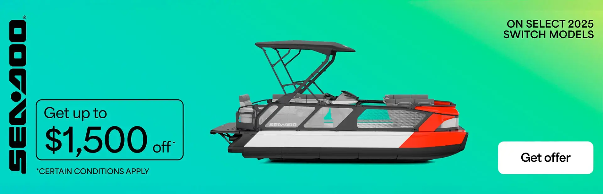 "©2025 Bombardier Recreational Products Inc. (BRP). All rights reserved. ®, ™ and the BRP logo are trademarks of BRP or its affiliates. In the U.S.A., products are distributed by BRP US Inc. Offers valid in U.S.A. only from December 1, 2025 to March 31, 2026. The conditions may vary depending on your location and this offer is subject to termination or change at any time without notice. This offer is not refundable, exchangeable or transferable (including from one dealership to another), cannot be redeemed for cash, credit or other products of equivalent value and cannot be combined with any other offer or rebate. Null where prohibited by law. Until supplies last. Returns of any portion of the purchase will require equal forfeiture of offer or amount equal to the offer. Eligible units are all new and unused 2025 Sea-Doo Switch models. Other Sea-Doo models may qualify for other promotions, see local dealers for details. † Rebate up to $1,500 on 2025 Sea-Doo Switch models: Consumers who purchase a 2025 Switch 18', 19' or 21' are eligible to a $1,500 rebate. Consumers who purchase a 2025 Switch 13' or 16' are eligible to a $1,000 rebate. Carefully read the operator's guide and safety instructions. Observe applicable laws and regulations. Children 12 and under must wear a personal flotation device (PFD) at all times. Always carry a personal flotation device for each person on board. Navigation and alcohol/drugs don’t mix. See your authorized BRP dealer for details and visit Sea-Doo.com."
